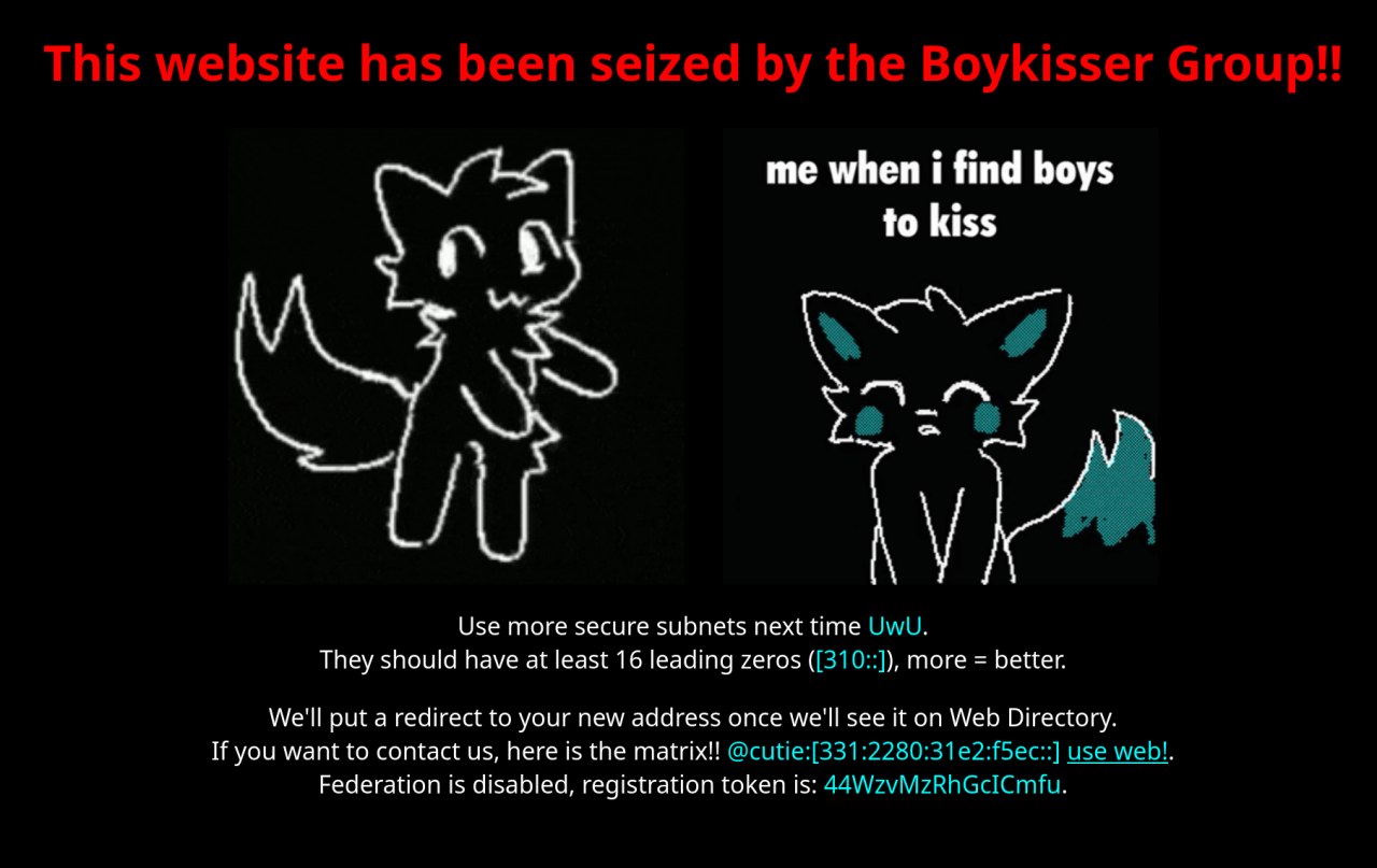 26 января группа хакеров Boykisser Group провела демонстрационную атаку на публичные подсети, начинающиеся с 300::, 301::, 302::. При обращении к сервисам в этих подсетях пользователи видели заглушку с сообщением о компрометации. К счастью, группа действовала в белых целях: основное их требование к владельцам ресурсов — повысить криптографическую стойкость адресов.
